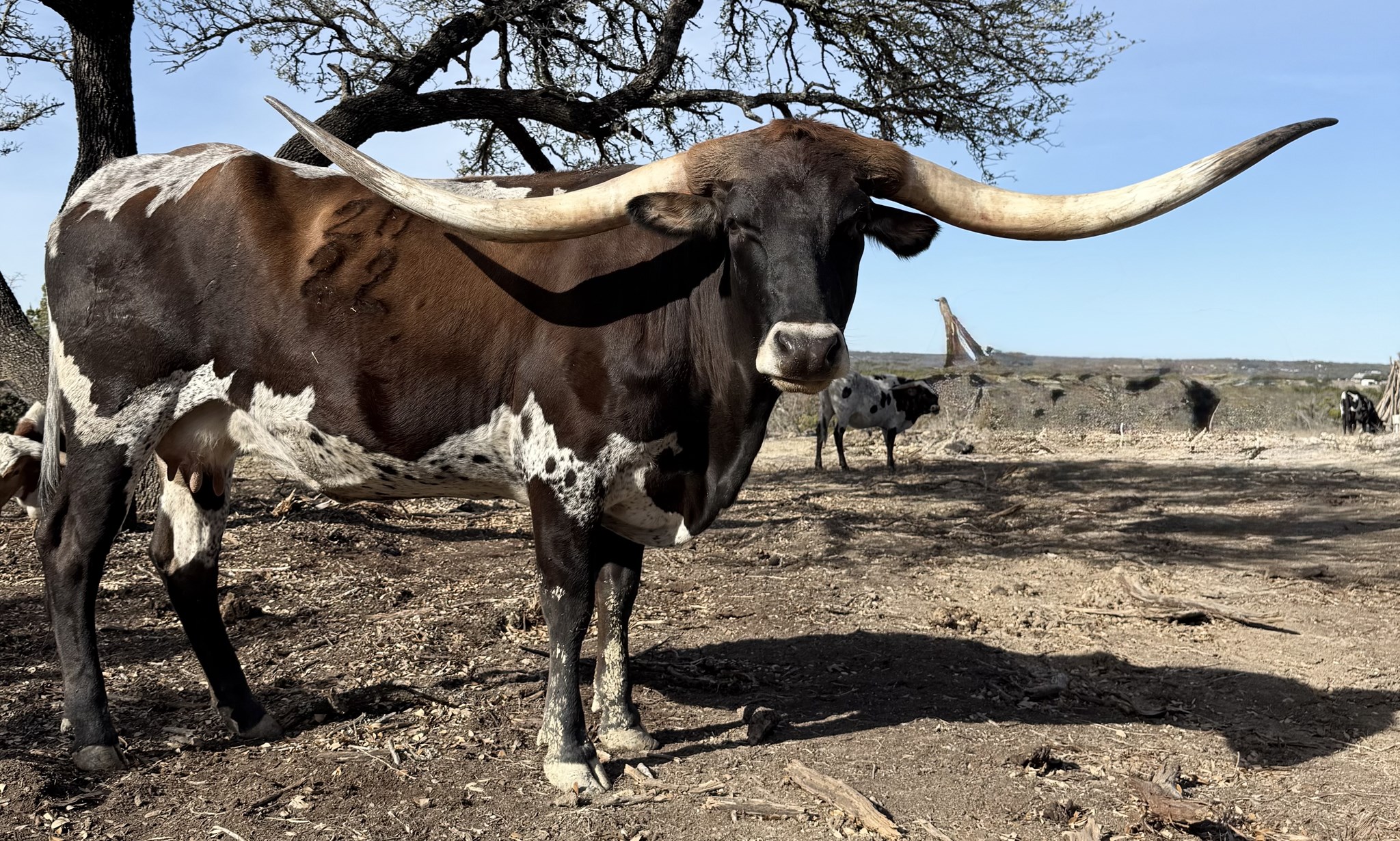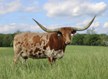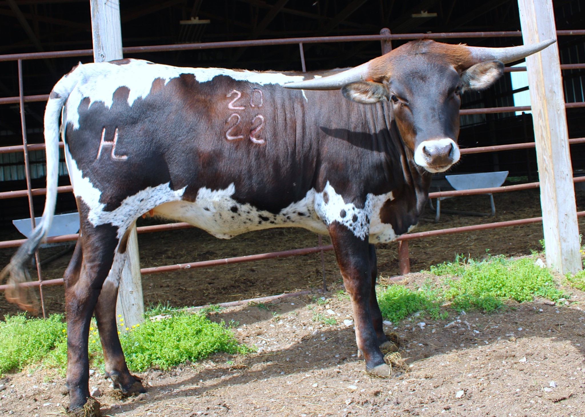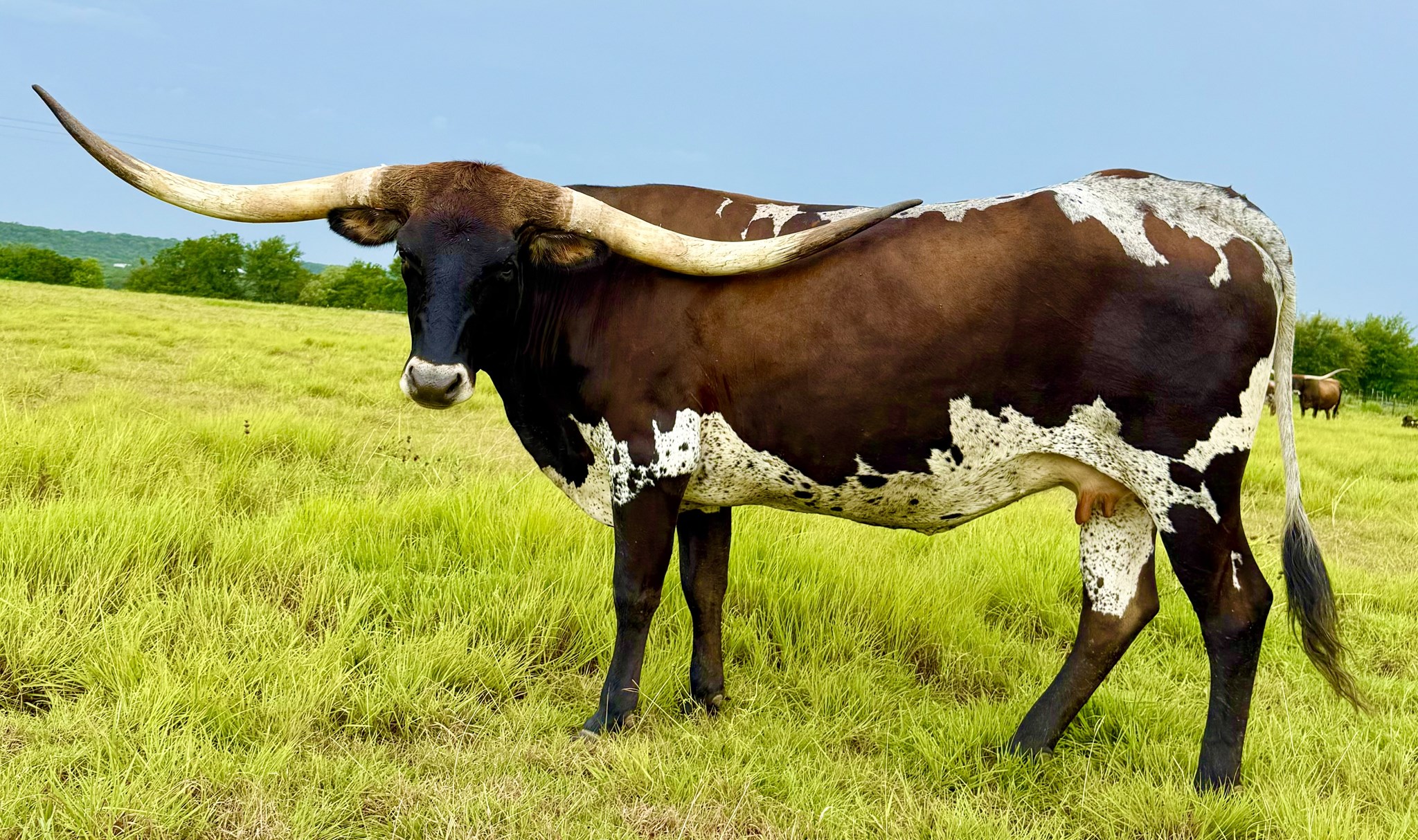 Everything about this Higher Ground daughter is large: horn, body, beauty. She also has a big heart!! :). Approaching you in the pasture, she gently lowers her head and patiently awaits poll scratches, even if you don't have cubes. Heidi hits the genetic motherload with her all-star pedigree containing a solid maternal Horseshoe J line with a dash of Fifty-Fifty. Had a bad day? Just spend time with this girl and she will turn it around. To top it off, her bull calf at side sold for 16K!! Thank you Bill and Elizabeth Hudson.